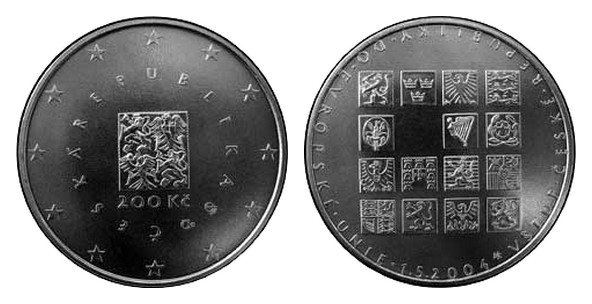 Pri príležitosti vstupu Českej republiky do Európskej únie bola v apríli 2004 vyhláškou Českej národnej banky č. 162/2004 Sb. vydaná pamätná strieborná minca v hodnote 200 Kč. Dvestokorunák bol razený v bežnej kvalite a v špičkovej kvalite určenej pre zberateľské účely s lešteným poľom mince a matným reliéfom.